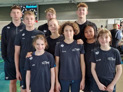 Bei den Jungen darf Tim Burckhardt (Jg. 2012) auf ein erfolgreiches Wochenende zurückblicken: über 50 m Freistil erreichte er mit neuer Bestzeit das Finale, in dem er die erst wenige Stunden alte Marke noch einmal um mehr als eine halbe Sekunde steigerte. Nach neuen Bestzeiten über 100 m Brust, 100 und 200 m Freistil erreichte er auch noch in neuer Bestzeit das Finale über 50 m Schmetterling, in dem aber nach zwei langen Wettkampftagen dann leider die Luft etwas raus war.